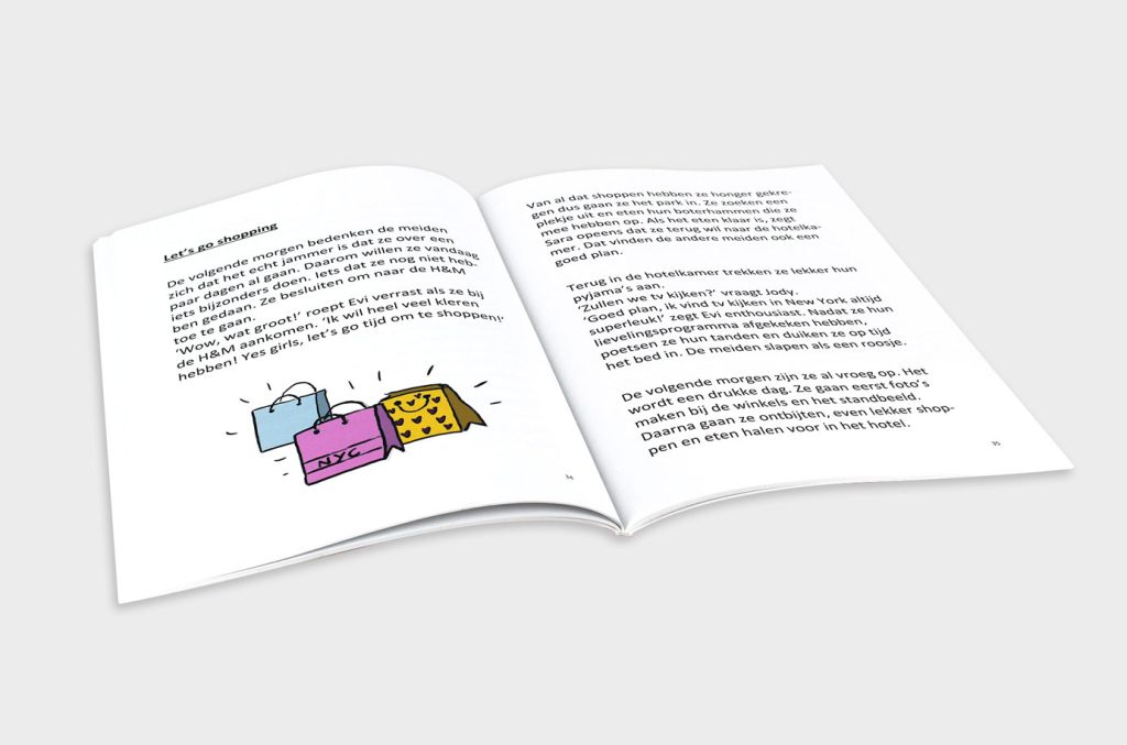 Evi speelt zelf de hoofdrol in haar boek. Het verhaal draait om haar grote droom om naar New York te gaan, iets wat haar moeder haar verbiedt. Samen met haar broertje Rens bedenkt ze een plan om toch naar de stad van de ‘Big Apple’ te kunnen gaan. In het boek gaat Evi samen met haar oudere nichten Sara en Jody op avontuur in New York. Rens (8), het broertje van Evi, vindt het leuk om een rol te hebben in het boek. “In het boek moet ik samen met Evi een plan bedenken. Dat doe ik ook altijd als ik snoepjes wil pakken”, glimlacht hij. Evi vond inspiratie voor dit onderwerp door ervaringen van haar moeder en door films die ze graag kijkt. “Mama heeft vroeger een tijdje in New York gewoond en ik vind films als ‘100% Coco New York’ erg leuk. Het schrijven van mijn eigen boek is een droom die uitkomt”, legt ze uit.